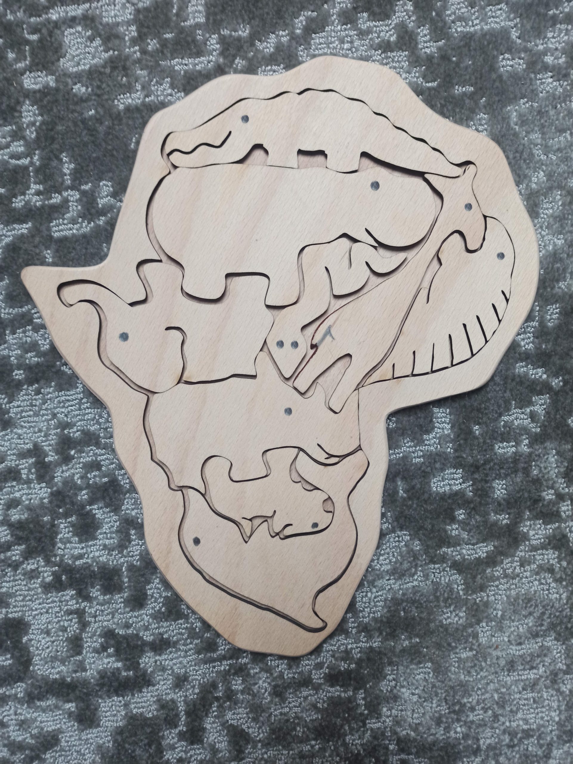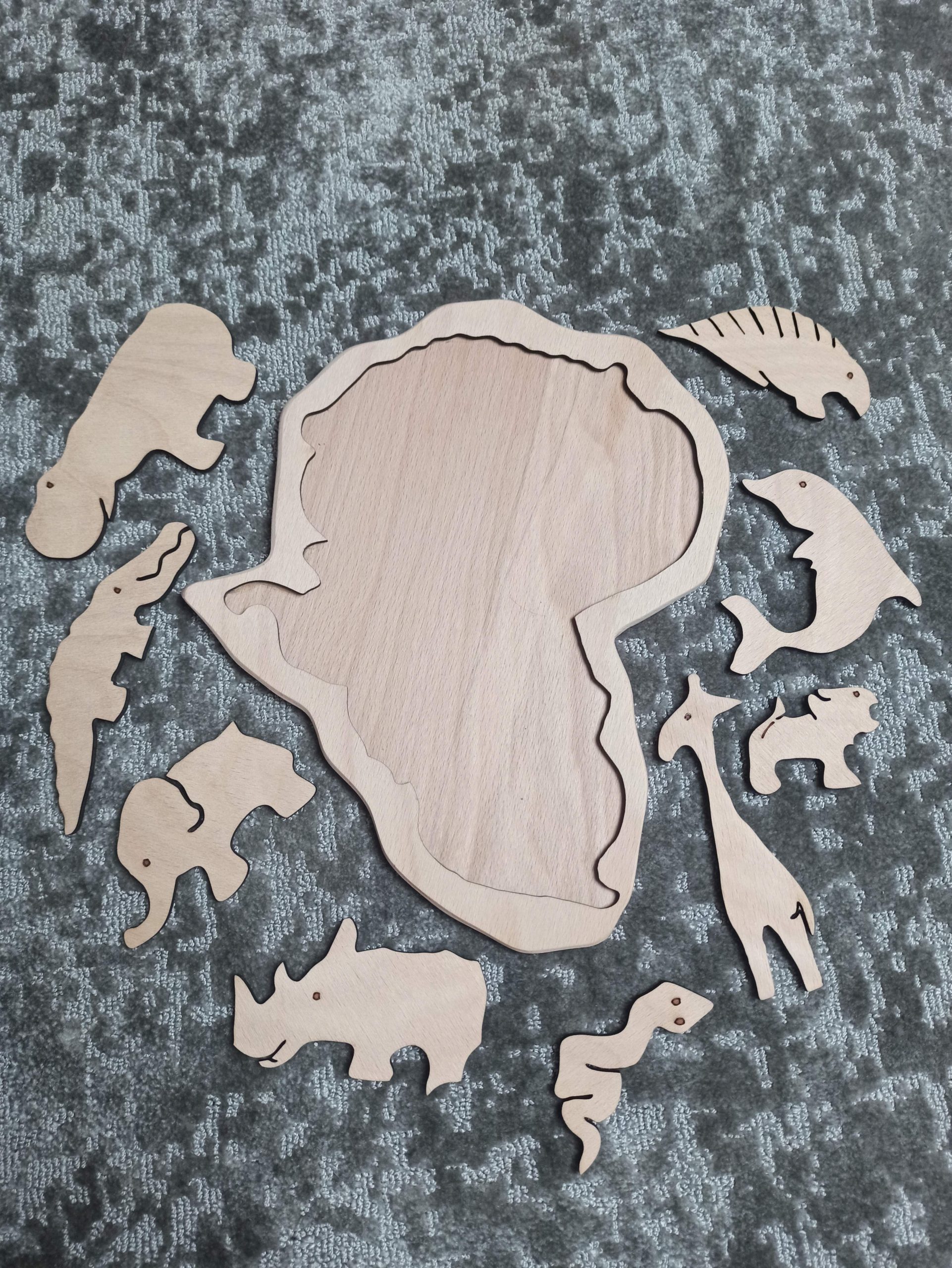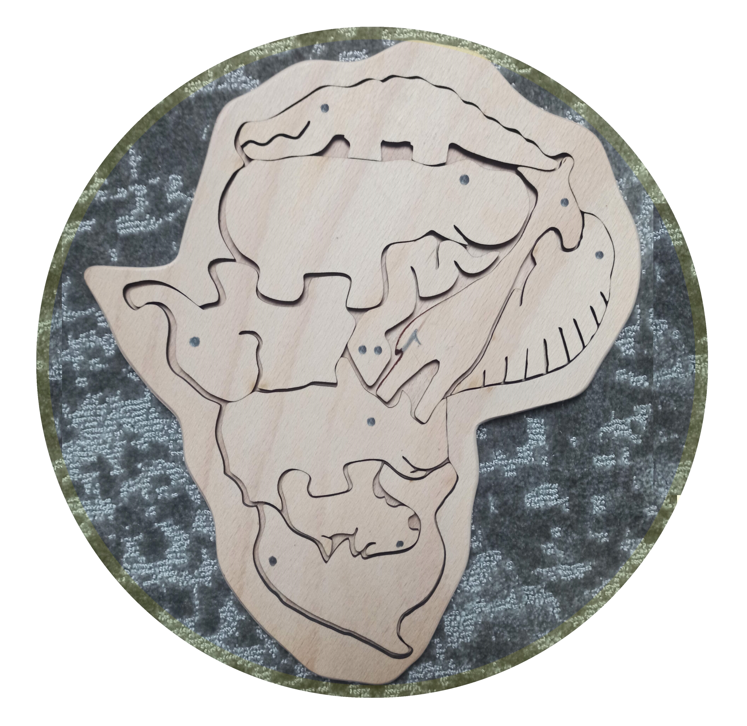 Představujeme naše dřevěné puzzle s africkými zvířaty v mapě Afriky! Úžasně velké puzzle k uspokojení nejednoho malého technika, či malou techničku. Puzzle je vyrobeno výhradně ze dřeva a není ošetřeno ani lakem, ani jinými barvami. Africké puzzle ozdobí nejeden pokojíček a zabaví nejedno šikovné a manuálně zručné dítko. Dílky jsou umístěné v podkladové desce, která má vyfrézovaný okraj tak, aby se zvířátka lehce vkládala, zároveň je puzzle navrhnuto tak, že každé zvířátko má své místo a vše do sebe musí krásně zapadnout. Puzzle zapadá do prvku Montessori, protože učí dítě motorickým schopnostem a rozvíjí jeho fantazii. Puzzle je nejlepší pro rozvoj jemné motoriky, zejména v koordinaci ruce-oči.